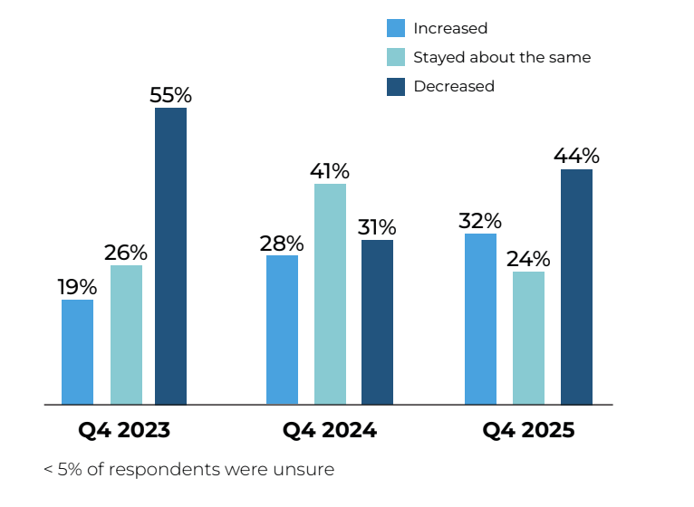 In Q4, 32% of retailers reported higher transaction counts year-over-year, up 4 percentage points from last year, though below last quarter’s levels. Average transaction count was flat at 0.0% year-over-year, down from modest growth in Q4 last year.