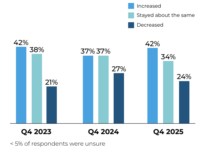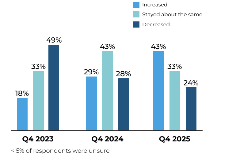 Anticipated budget growth softened in Q4, with fewer retailers planning increases compared to last quarter. The average expected increase of 8.3% held steady from last quarter, indicating that those planning growth remain relatively optimistic.